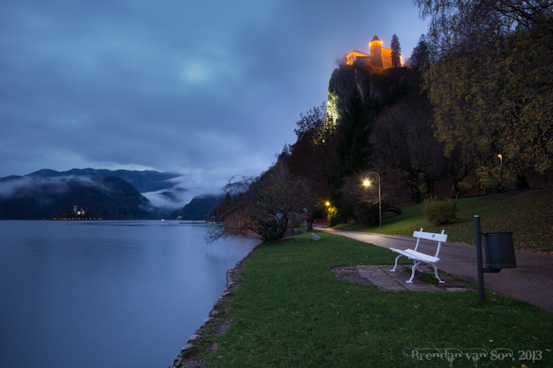 I lean my toes out onto the ledge of a ridge below the castle and peer out at the quickly bluing sky. I wonder if I can race down to the lake-side before I lose the good light. With a heavy fog wisping through the forest trail, I feel like I’m racing through smoke towards a fire. At the side of the lake, just a couple minutes worth of a lumbering jog away, Bled Castle looks like a firefly in the sky, so small yet overwhelming. I snap a photo then pack my gear up and climb back up towards a warm bed.